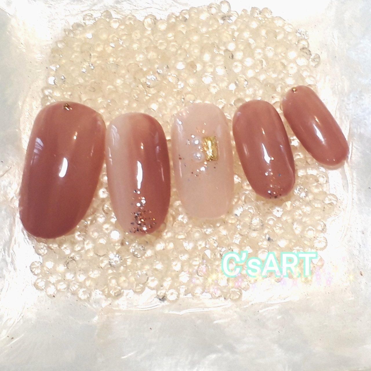 秋ネイル ピンクベージュのワントーン ストーンアートで上品な大人ネイルに マキアオンライン Maquia Online